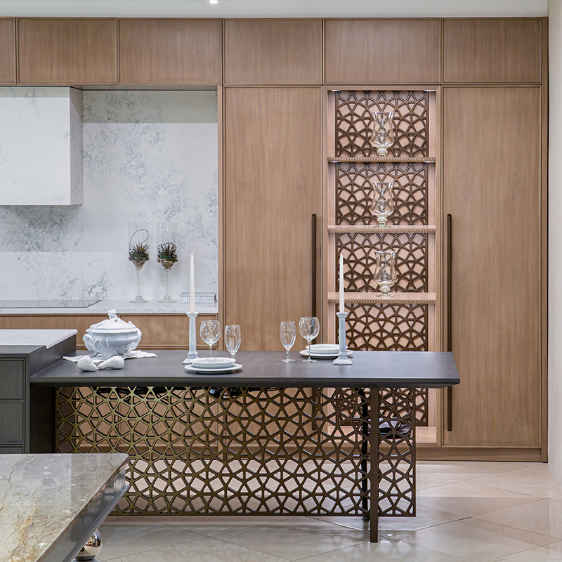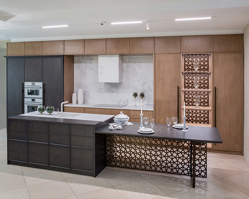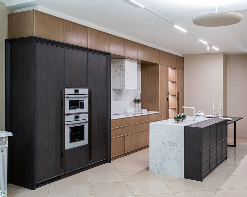 Il nostro storico partner Salone Interni №1 a Mosca ha inserito nella propria showroom la cucina Diamante in finitura T1N su noce con colonne in finitura 74 su noce. Un mix di finiture che bene si intrecciano e rendono la cucina particolare ed armoniosa. Composizione di basi, colonne e isola molto funzionali.