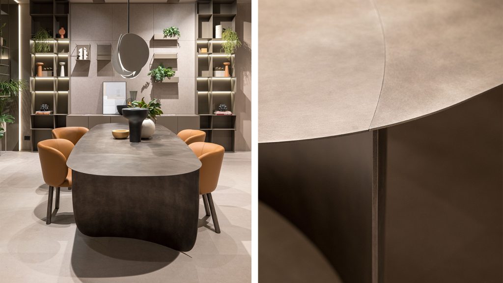 Per questo nel suo percorso di ricerca Ronda Design cerca di proporre il metallo nella sua forma più pura. Quest’anno due dei tre tavoli presentati avevano sia struttura che top in metallo. Il nuovissimo tavolo da pranzo Foil (design Gino Carollo) e il tavolo Crave in raffinate finiture brunite si sono distinti per il design sottile e audace, dichiarando in modo netto qual è la visione di arredo Ronda Design.